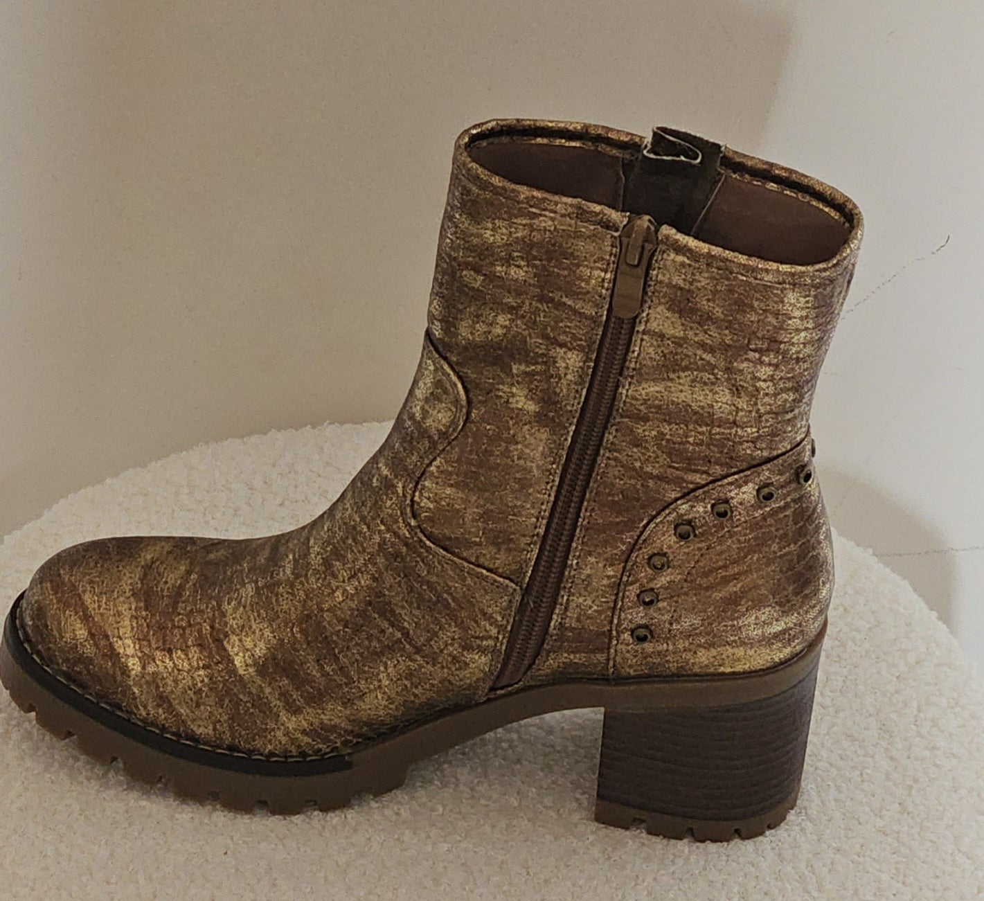 Osez briller avec ces bottines dorées effet croco, une pièce forte au caractère affirmé. Leur fini métallisé embossé façon croco attire tous les regards, tout en restant chic et facile à associer.