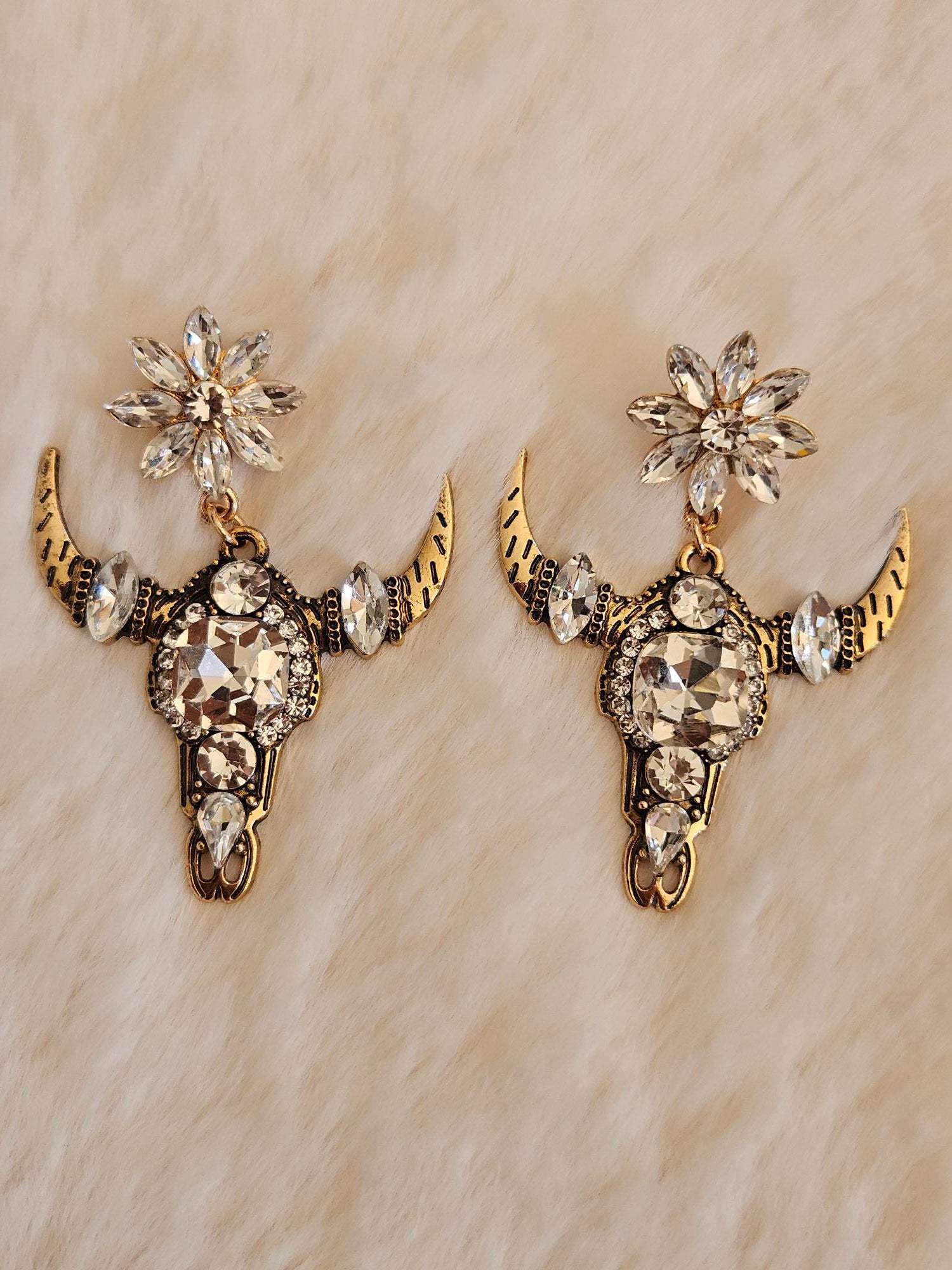 Osez un bijou de caractère avec ces boucles d'oreilles tête de taureau serties de strass., qui mêlent puissance symbolique et éclat glamour.