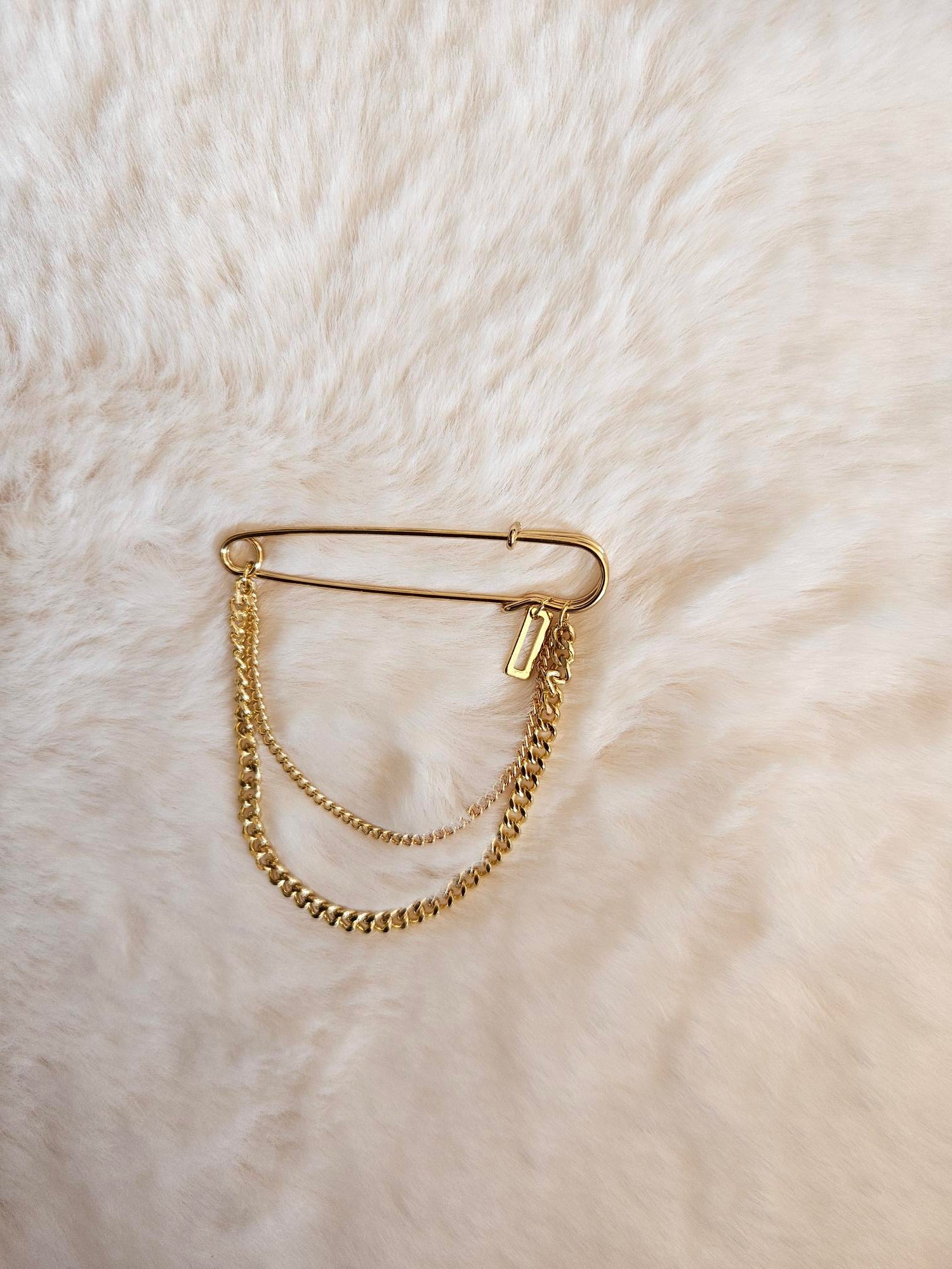 Apportez une touche tendance et audacieuse à vos tenues avec cette broche épingle dorée, sublimée par de fines chaînes pendantes. Son design minimaliste mais structuré en fait un accessoire moderne, parfait pour rehausser une veste, un blazer ou un pull uni.
