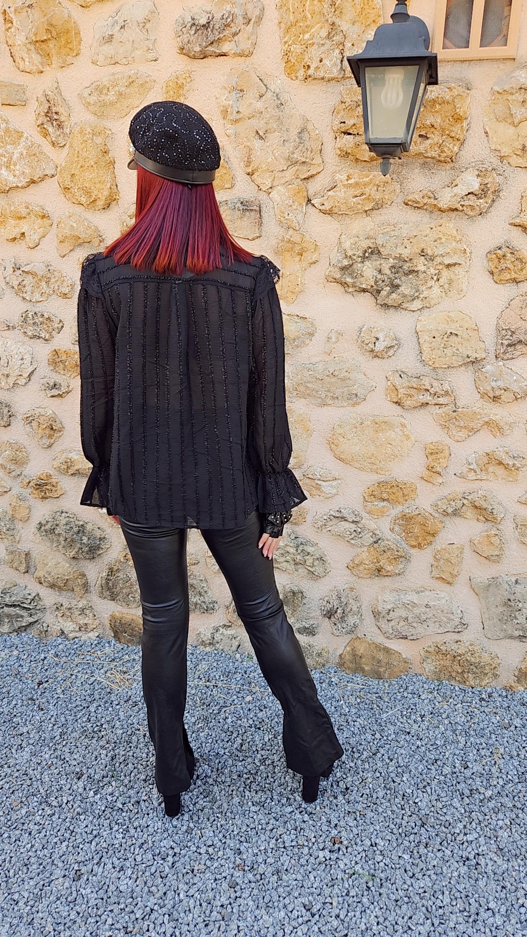 Subtilement audacieuse, résolument raffinée. Cette chemise noire transparente est une ode à la féminité moderne : une alliance parfaite entre sensualité, éclat discret et sophistication couture. Le voile noir laisse entrevoir la peau avec finesse, rehausse de détails en dentelle pour une touche romantique et raffinée. Un équilibre subtil entre mystère et élégance.