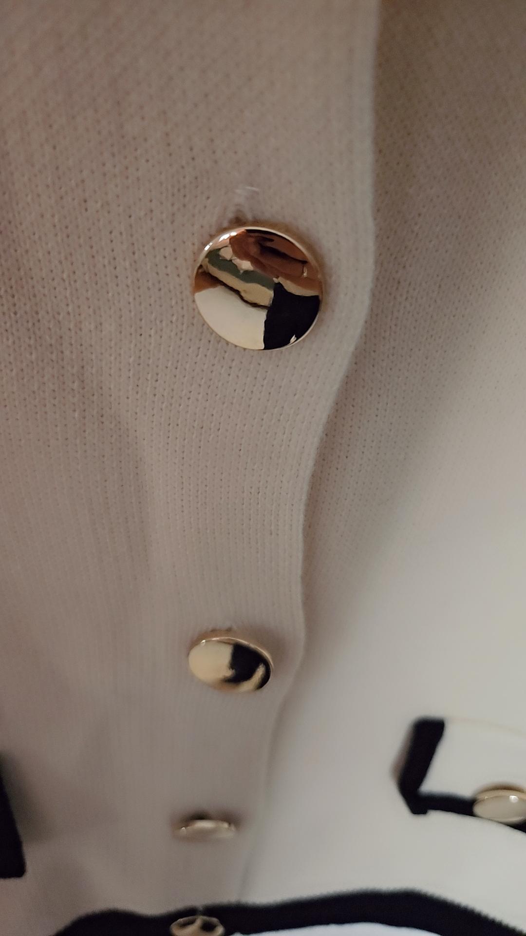 La veste droite, à la coupe légèrement cintrée, est sublimée par de fins boutons dorés sur les poches, apportant une note précieuse et lumineuse. Le détail subtil mais affirmé : un liseré noir contrastant qui souligne délicatement la bas de la veste et du pantalon, créant une ligne graphique et élégante.