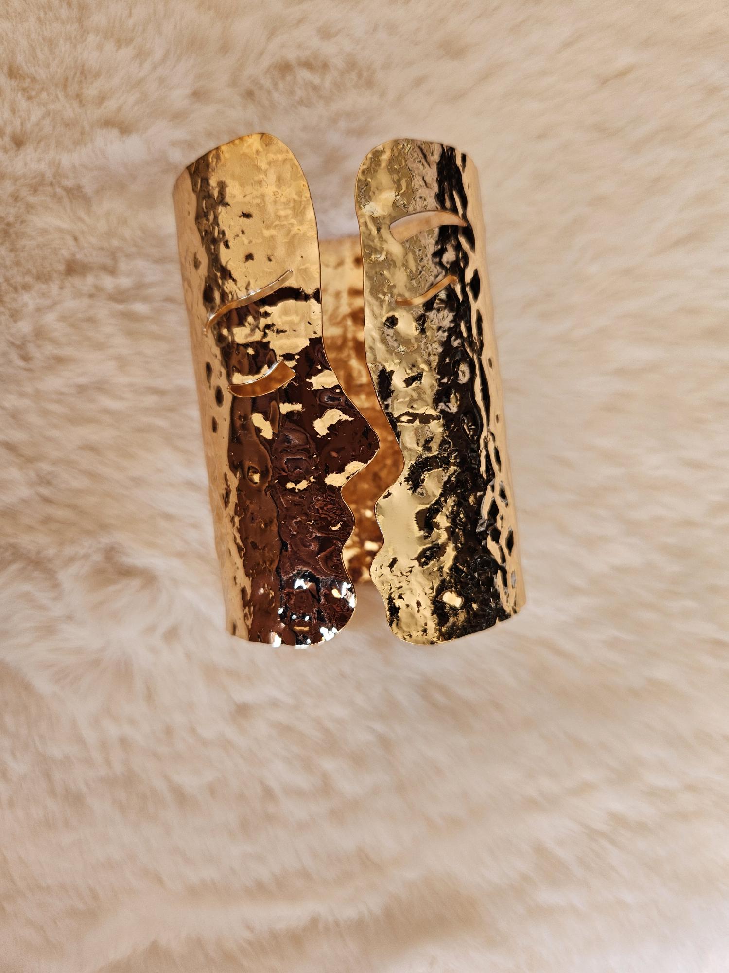 Son fini doré brillant capte la lumière et sublime le poignet avec élégance, tandis que les détails des visages apportent une touche unique et expressive à ce bijou de caractère.