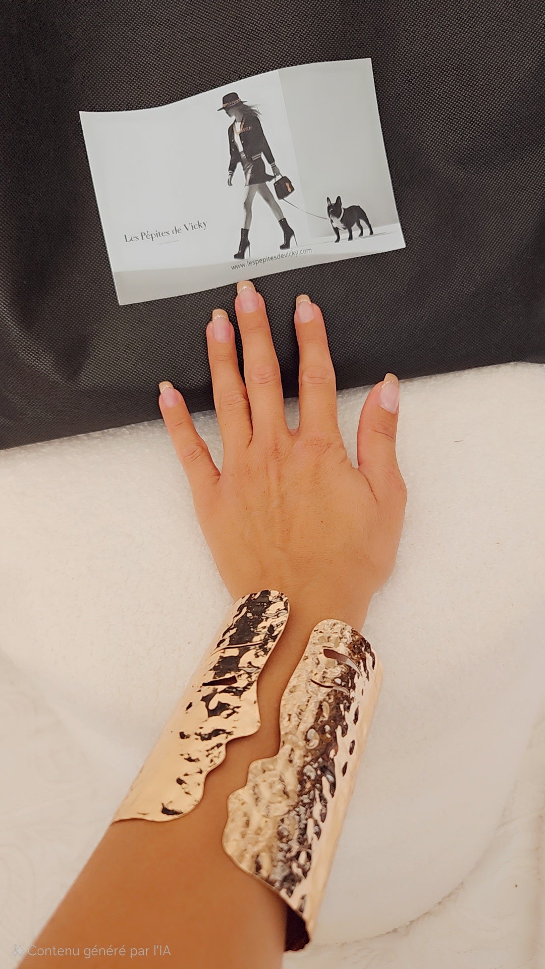 Faites une déclaration artistique avec cette manchette dorée au design sculptural et audacieux. Ouverte et ajustable, elle se distingue par ses deux visages finement gravés à chaque extrémité, évoquant une inspiration antique et symbolique.